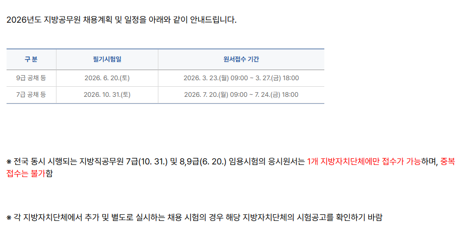2026년 지방공무원 시험일정 사전안내 : 26/6/20