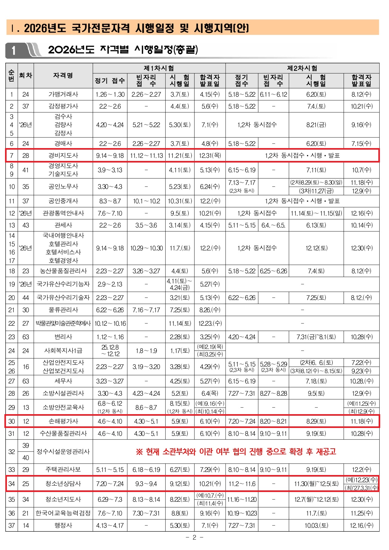 26년도 국가전문자격시험 사전공고(손해평가사, 청소년상담사, 경비지도사)