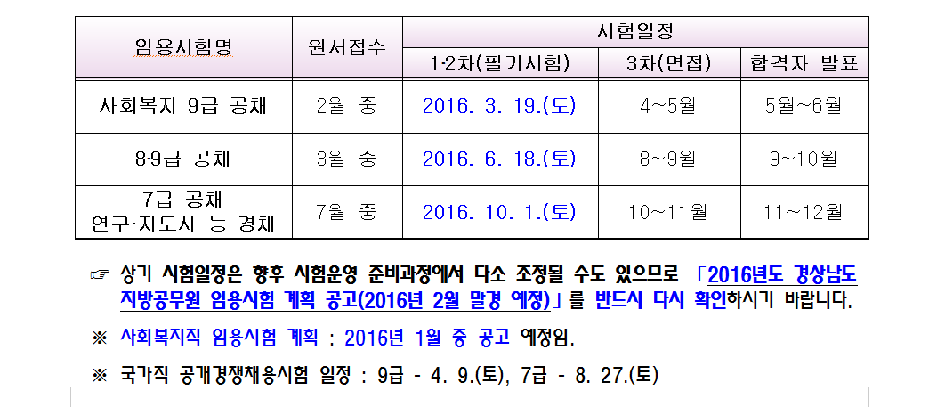 2016년도 경남 지방공무원 임용시험 일정 안내