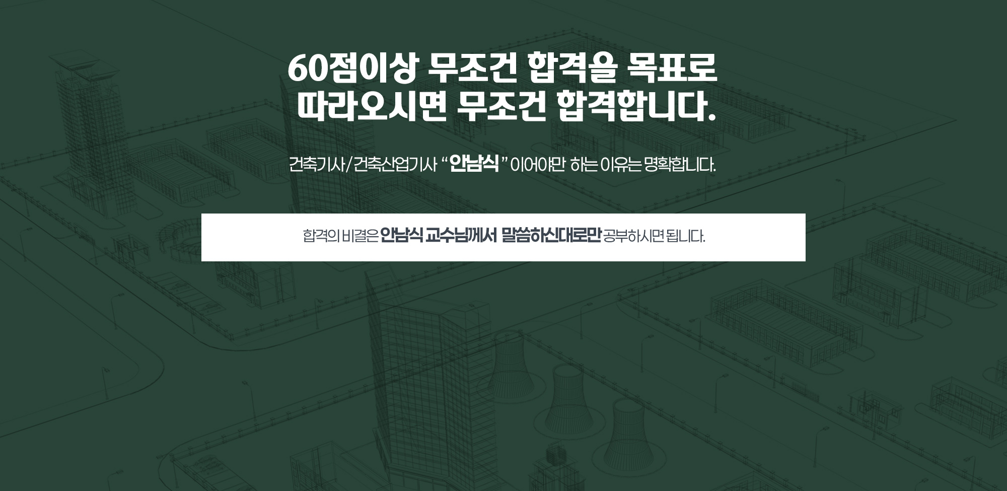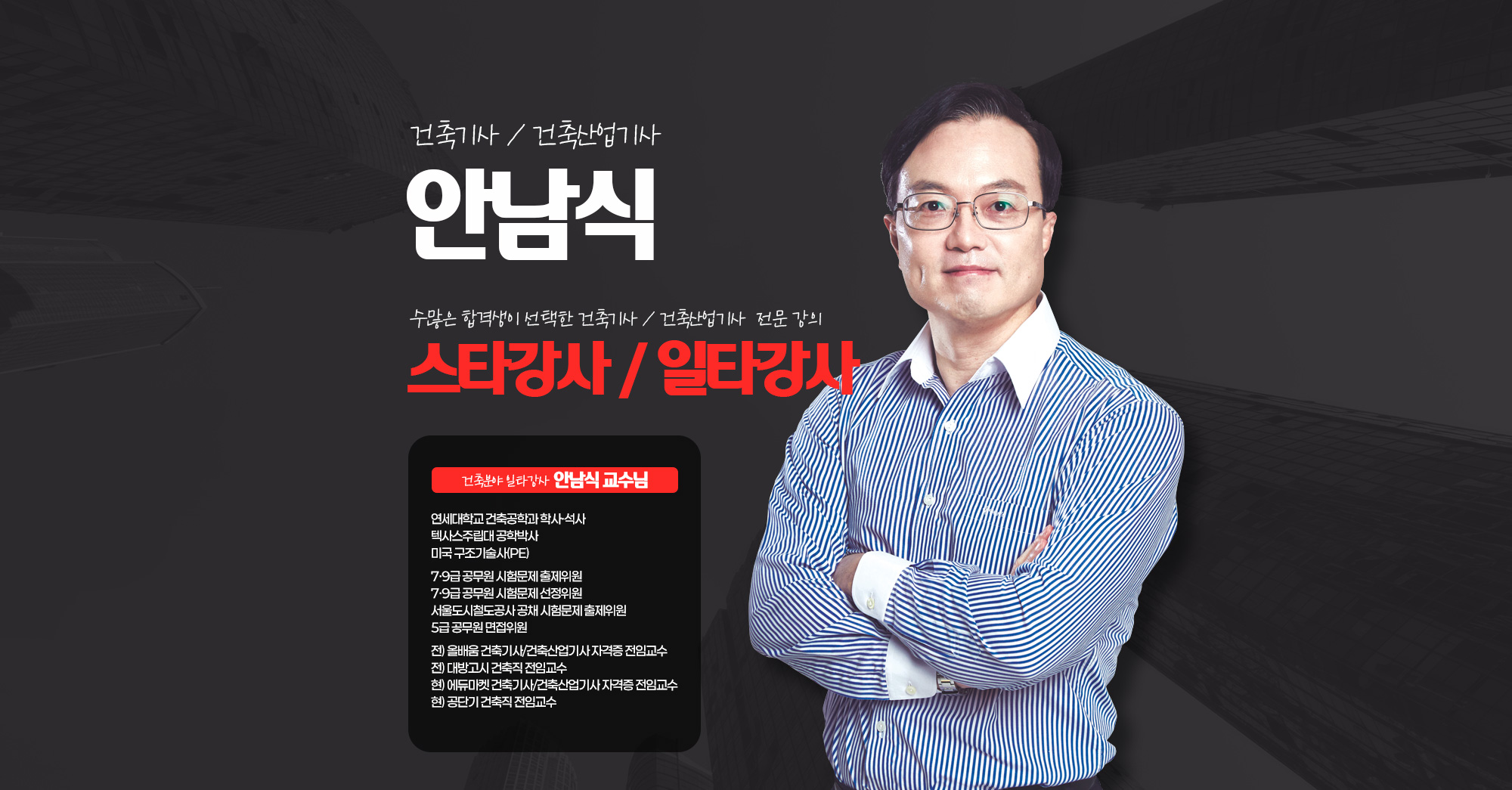 건축기사를 준비하시는 분들께 안남식 교수님의 강의를 자신 있게 추천드립니다. 혼자 하는 공부보다 훨씬 효율적이고, 공부가 재미있어질 겁니다